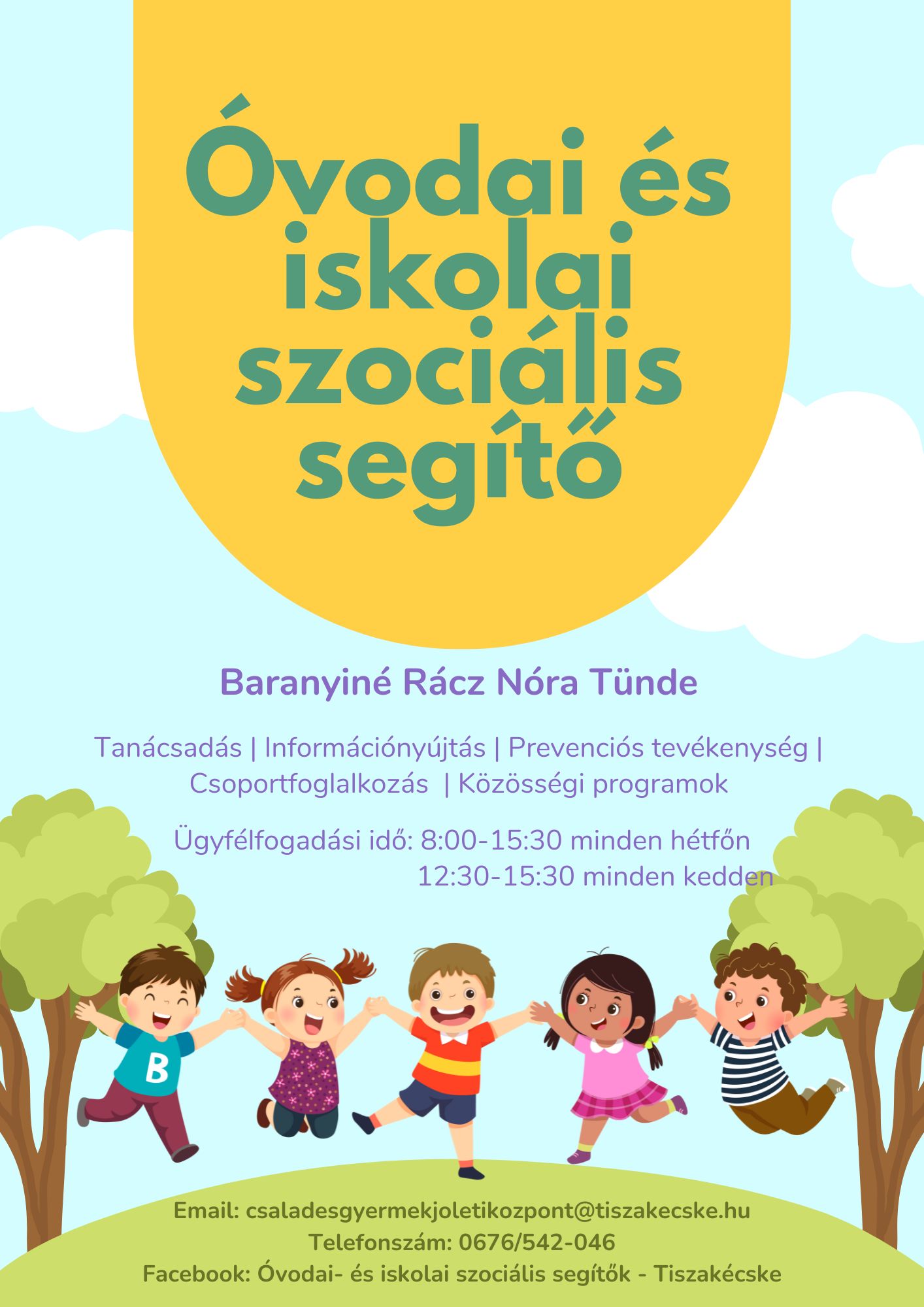 Szociális segítőként többféle helyzetben is számíthatnak rám. Segítem a gyermekek beilleszkedését a közösségbe, támogatom a szülőket a neveléssel kapcsolatos kérdésekben, és együtt gondolkodom a pedagógusokkal akkor, ha egy gyermeknek vagy családnak további segítségre van szüksége. Emellett tájékoztatást és tanácsot adok különböző ellátásokkal, szolgáltatásokkal kapcsolatban, valamint lehetőség van személyes beszélgetésre is, empatikus, biztonságos keretek között.